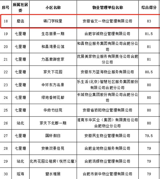 近日,2020年合肥市第三季度物业服务质量测评结果公布,文一物业所管理的多个小区综合得分位居排名前列,优质服务得到权威肯定。