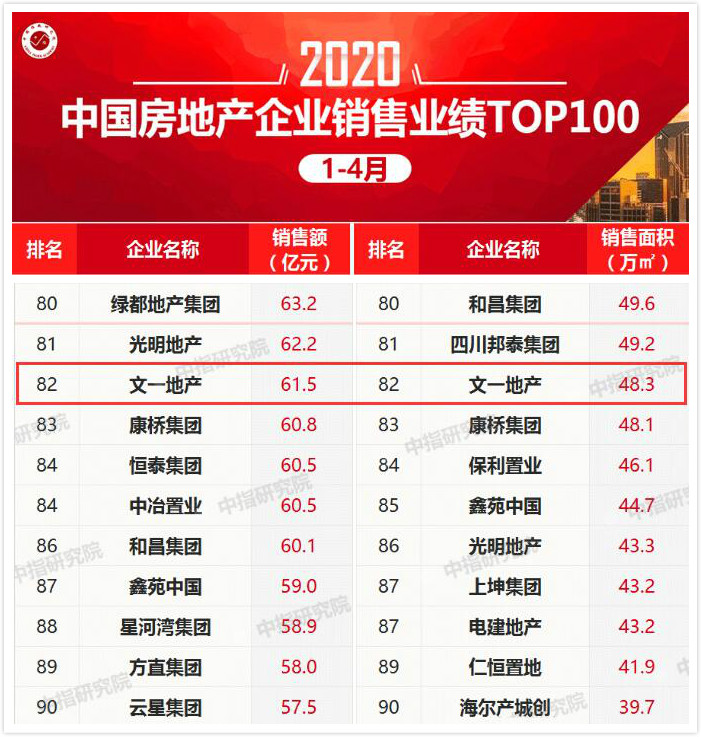 4月30日晚,中国指数研究院权威发布《2020年1-4月中国房地产企业销售业绩TOP100》榜单,文一地产位列销售额排行榜第80位、销售面积排行榜第74位,连续数月稳居安徽本土房企首位。