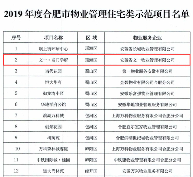 4月30日,合肥市住房保障和房产管理局发布《关于表彰2019年度合肥市物业管理示范项目的通报》,公布了2019年度合肥市物业管理住宅类示范项目名单,全市共19家小区入选,文一物业管理的文一·名门学府项目成功荣获“2019年度合肥市优秀示范小区”称号,