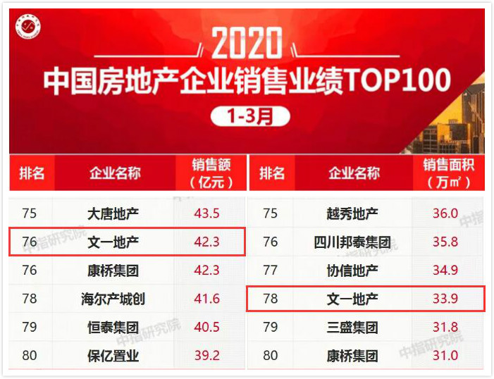 3月31日晚,中国指数研究院权威发布《2020年1-3月中国房地产企业销售业绩TOP100》榜单,文一地产位列销售额排行榜第76位、销售面积排行榜第78位,稳居安徽本土房企首位。