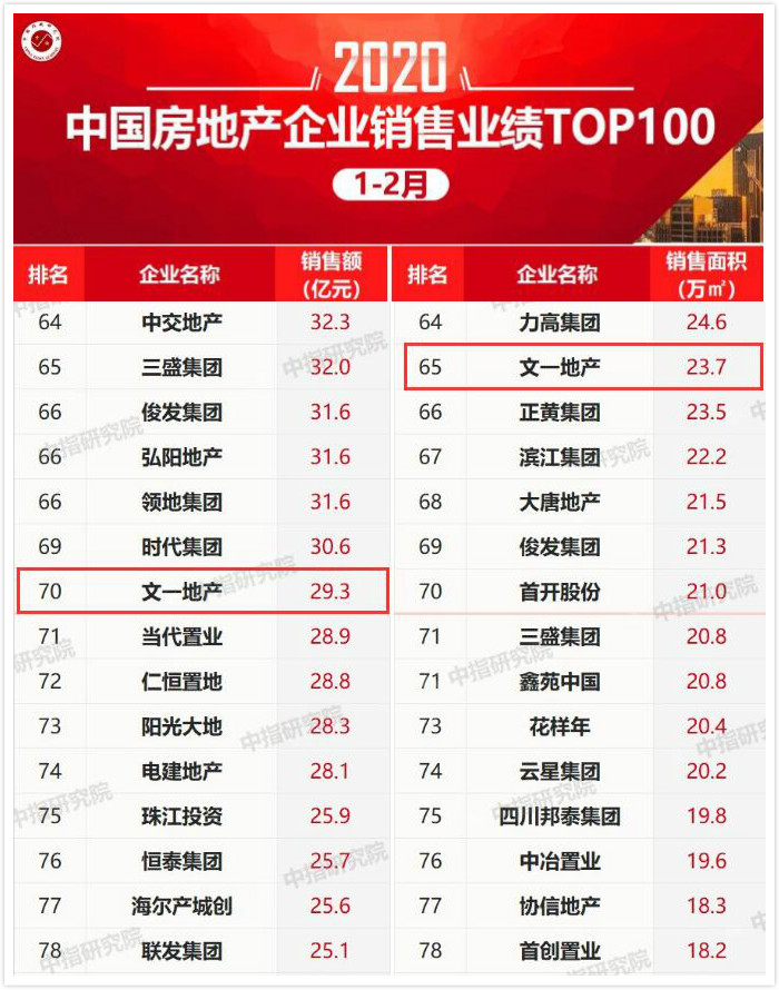 2月29日,中国指数研究院权威发布《2020年1-2月中国房地产企业销售业绩TOP100》榜单,文一地产名列销售额排行榜第70位,销售面积排行榜第65位,位居上榜安徽房企首位。