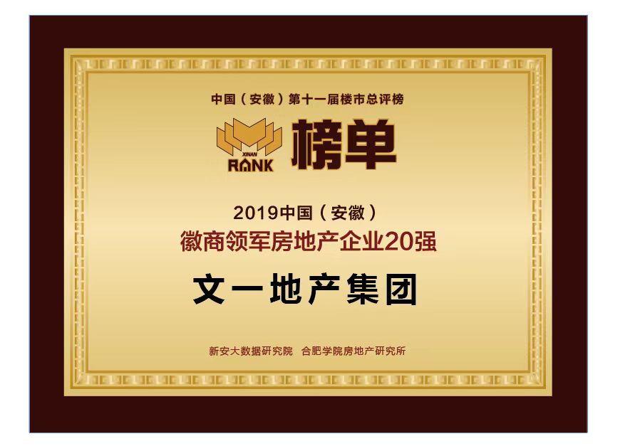 2020年1月8日,在中国(安徽)第十一届楼市总评榜发布会上,文一地产荣登 2019中国(安徽)徽商领军房地产企业20强、2019中国(安徽)第十一届楼市总评榜房地产企业销售金额20强!
