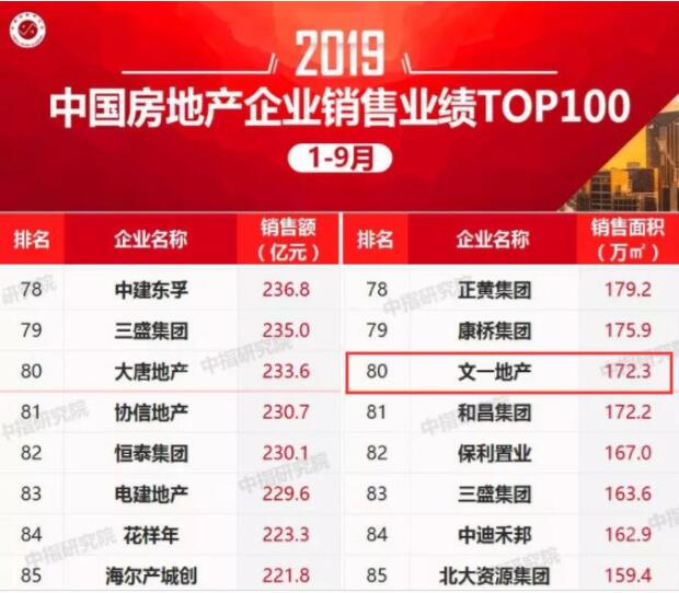 9月30日,中国指数研究院权威发布《2019年1-9月中国房地产企业销售业绩TOP100》榜单,文一地产以216.9亿元名列销售额排行榜第87位,以172.3万㎡名列销售面积排行榜第80位。