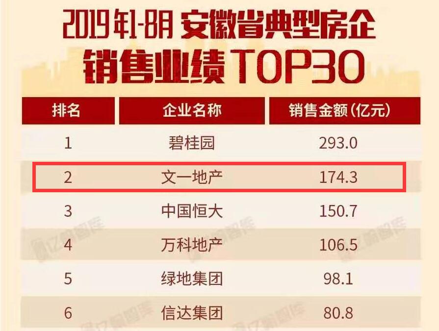 9月4日,亿翰智库华东院发布《2019年1-8月安徽省典型房企销售业绩TOP30》榜单,文