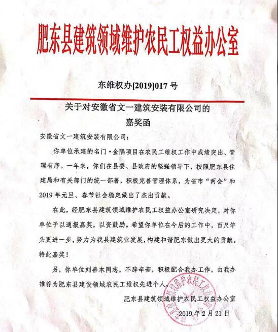 2月21日,肥东县建筑领域维护农民工权益办公室发文(东维权办【2019】017号、东维权